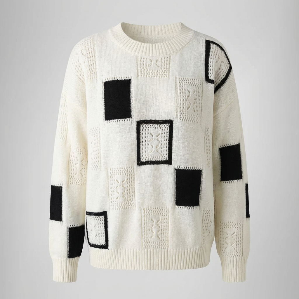 De combinatie van opengewerkte patronen en contrasterende blokken geeft een unieke, modieuze look.